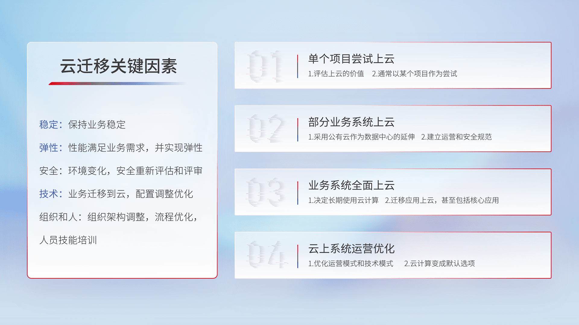 结合实际业务,,,,从规划设计、、、、云平台选型、、、、云原生改造、、、数据迁移、、、集成交付,,迁移全过程为客户识别最佳上云路径,,,,做好风险识别管理,,设计网络架构、、、身份权限、、、安全审计合规、、、操作审计、、日志审计、、监控告警策略、、多站点容灾设计等,,对云上基础设施进行整体规划,,,,提升IT治理水平,,,,以满足弹性、、、、高可用、、、高性能的需求。。