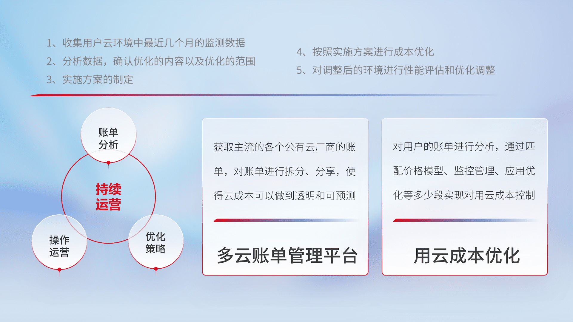 通过多云纳管,,,,以统一的资源数据模型把客户的云资源进行抽象和封装,,进而实现对多云资源的统一操作,,保障云资源管理的可靠性、、、稳定性与可用性。。。量身定制化运维内容,,配置、、、开发运维、、、、补丁管理、、、备份、、、监控、、认证和访问管理、、、审计和日常巡检等,,,,保障在用云过程中的可靠度,,,,稳定度以及高可用率。。。