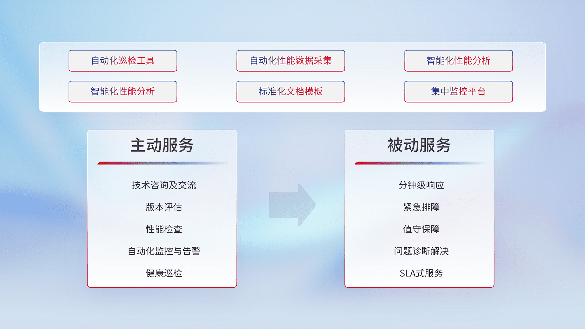 智能化工具和标准化文档,,,保障服务质量,,,提供主动服务(包含技术咨询、、、版本评估、、、性能检查、、、、自动化监控与告警、、、健康巡检)和被动服务包含(分钟级响应、、、紧急排障、、、、值守保障、、、问题诊断解决、、SLA服务)。。。。